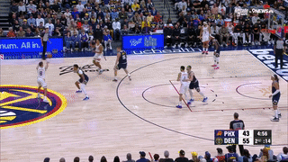 次节,面对太阳的三分攻势,瓦兰连续得分,穆雷突破拉杆得分,小布朗连得5分输送火力并且帮助掘金领先到两位数;布克两罚全中,奥尼尔命中三分,沃特森回应2+1,掘金一直保持领先,4分52秒约基奇对伊戈达罗凶狠犯规,吃到一级恶意犯规;上半场最后阶段,约基奇助攻戈登上演360度转体折叠暴扣,之后约基奇补篮得分,戈登命中三分,穆雷三分也中,掘金一攻攻势扩大领先,半场打完掘金71-54领先太阳17分。