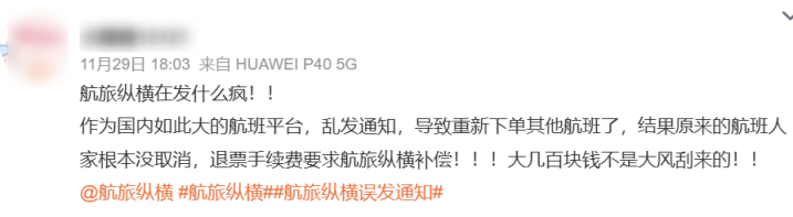近日,多位网友反映,在11月29日下午15:00左右收到来自航旅纵横的航班取消提醒,部分用户在重新购票后才发现,实际航班并未取消,而是由于航旅纵横出现系统故障,推送了错误信息。不少用户因此额外承担了票价差价及退票手续费。