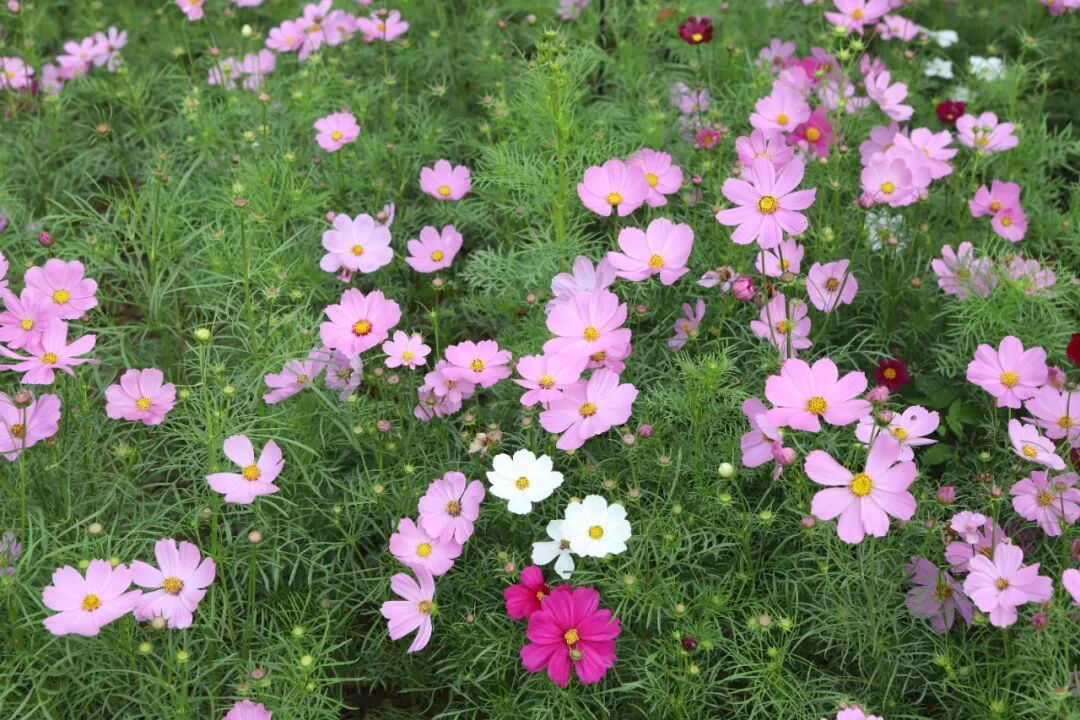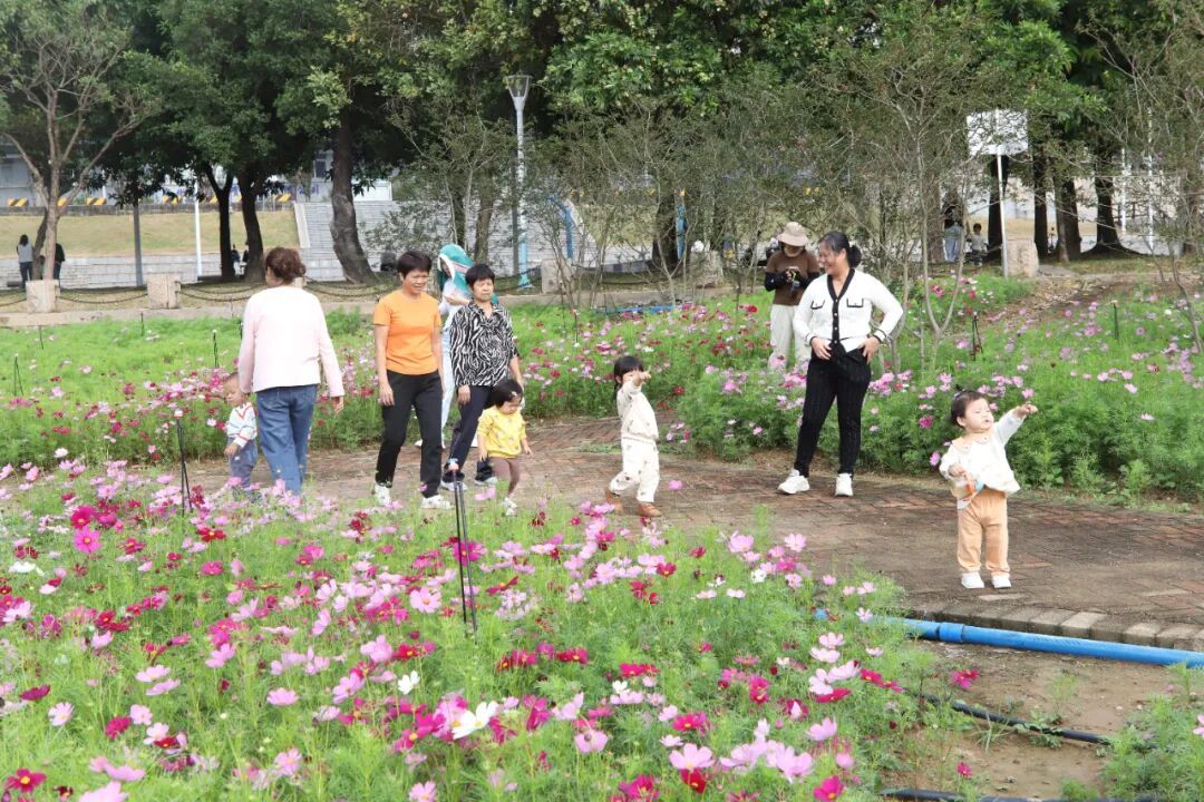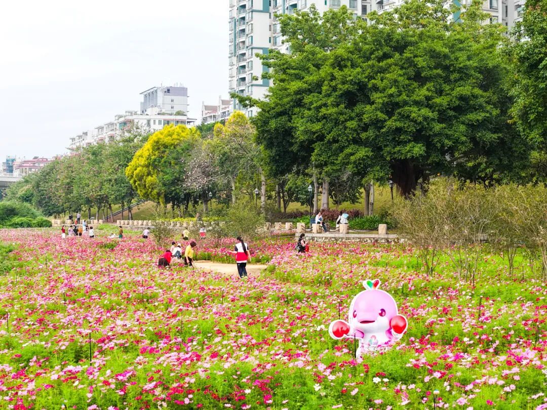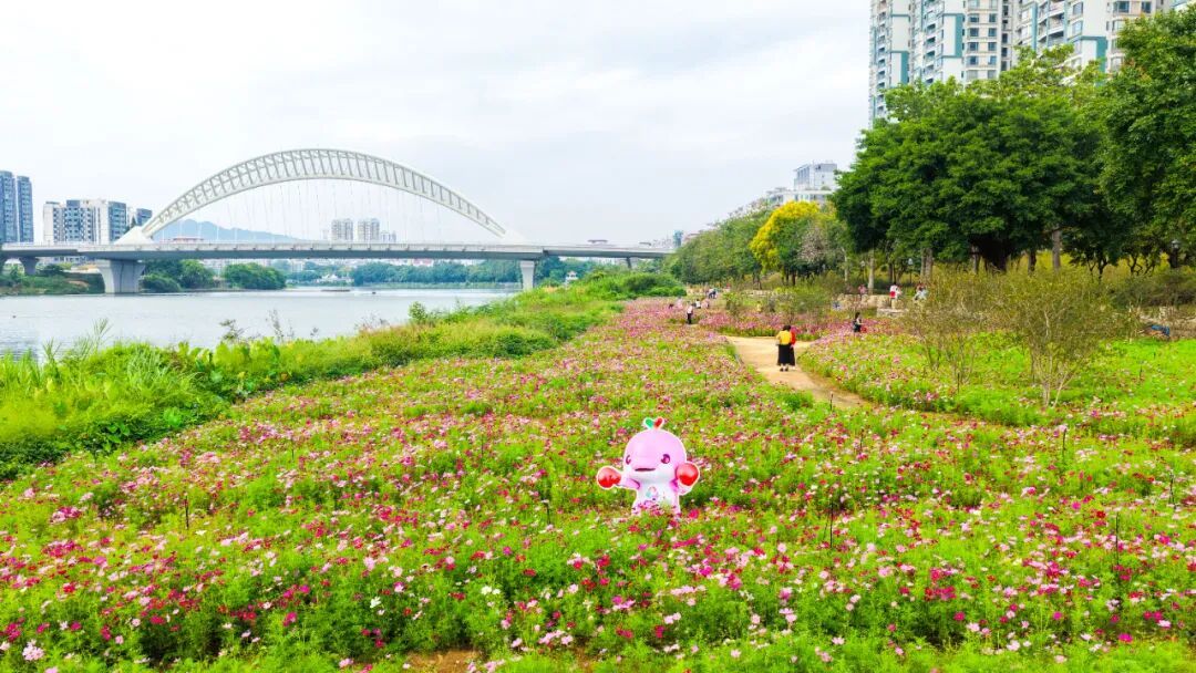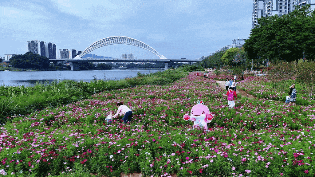 在流溪河边的绿道广场,波斯菊竞相绽放,形成一片绚烂花海,微风拂过,花枝摇曳,令人陶醉。