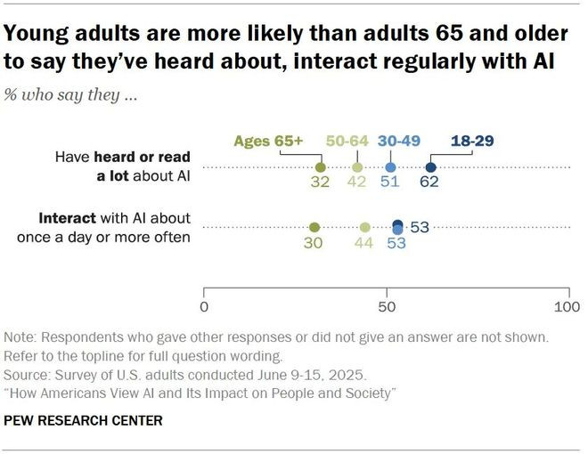 不同年龄段每天使用AI的比例对比。18–29岁的年轻人是最频繁、最熟悉AI的群体:53%每天使用一次以上,远高于65+的30%。